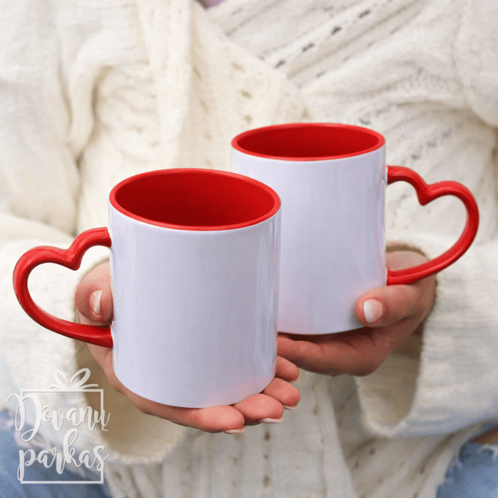 Baltas puodelis su individualiu dizainu. Ypatingas dėl spalvotos širdelės formos rankenėlės. Rankenėlė raudonos spalvos.